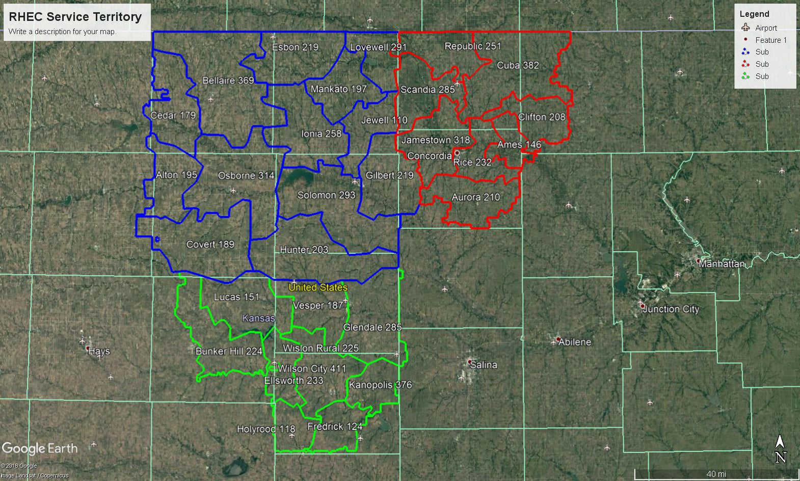 Effective January 1, 2002, members of Smoky Hill Electric (green), Jewell-Mitchell Electric (blue) and NCK Electric (red) gave their approval to consolidate and become Rolling Hills Electric Cooperative, Inc.